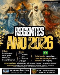 Jogo do ano de 2024 (Brasil/Mundo) Anualmente, no mês de janeiro ocorre uma apuração para descobrir as energias que irão reger os países, isto ajuda os devotos e praticantes de Ifá e Òrìṣà saber o que se espera a nível coletivo. O Bàbáláwo Olaifa Alberto Junior – Ogboni Iwashe Egbe possui mais de 14 anos